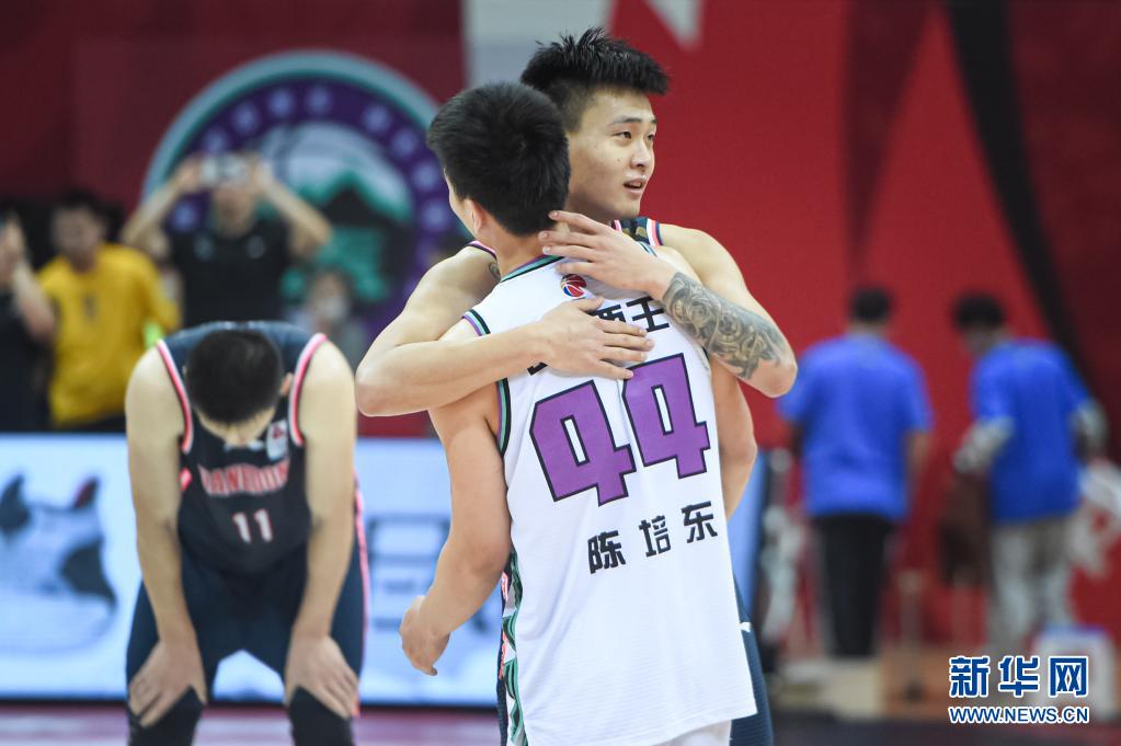 4月22日,廣東東莞大益隊球員趙睿(右)在比賽結束后擁抱安慰山東西王隊球員陳培東。