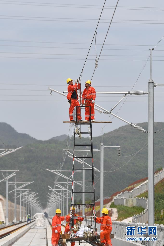4月18日,施工人員在杭紹臺(tái)鐵路上進(jìn)行接觸網(wǎng)導(dǎo)線調(diào)整作業(yè)。 當(dāng)日,由中國(guó)中鐵電氣化局參建的杭紹臺(tái)鐵路在浙江天臺(tái)縣開始架設(shè)第一條接觸網(wǎng)導(dǎo)線,標(biāo)志著杭紹臺(tái)鐵路電氣化工程進(jìn)入核心技術(shù)施工階段。據(jù)了解,杭紹臺(tái)鐵路全部接觸網(wǎng)導(dǎo)線架設(shè)及調(diào)整施工計(jì)劃于7月底完成。 杭紹臺(tái)鐵路是我國(guó)首條民營(yíng)資本控股的高速鐵路項(xiàng)目。該線路連接浙江杭州、紹興和臺(tái)州三地,線路設(shè)計(jì)時(shí)速350公里。 新華社記者 黃宗治 攝