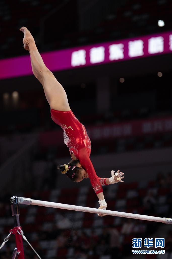 5月5日,廣東隊選手羅蕊在高低杠比賽中。
