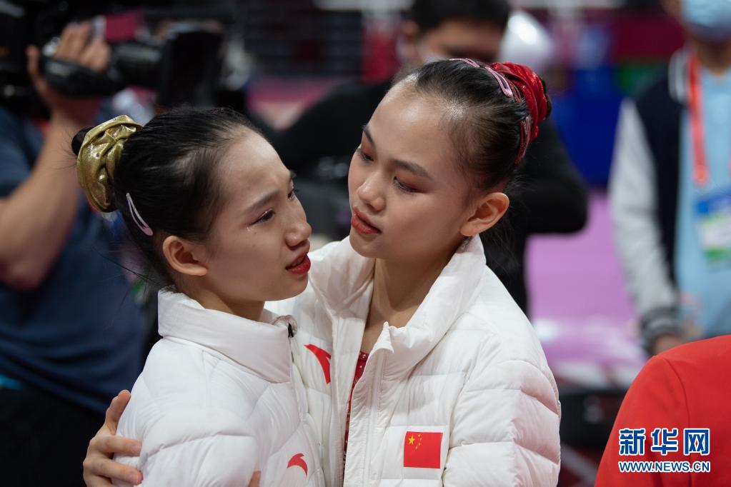 5月5日,廣東隊(duì)選手陳一樂(右)與隊(duì)友歐鈺珊在比賽后擁抱。 當(dāng)日,2021年全國體操錦標(biāo)賽暨東京奧運(yùn)會選拔賽、第十四屆全運(yùn)會體操資格賽女子團(tuán)體賽在四川成都舉行。廣東隊(duì)、北京隊(duì)、浙江隊(duì)分別以222.428、216.061、214.695分的成績獲得女子團(tuán)體一、二、三名。 新華社記者 胥冰潔 攝