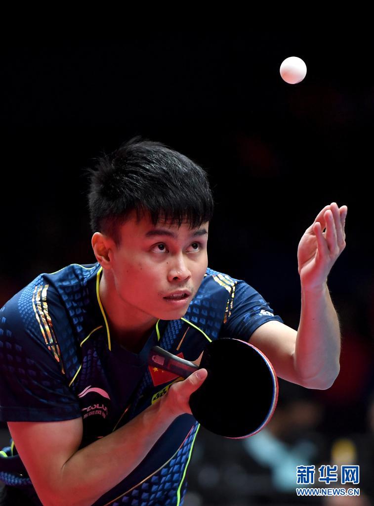 5月7日,周啟豪在比賽中發球。 當日,在河南省新鄉市舉行的2021“直通WTT大滿貫·世乒賽”暨奧運模擬賽男子單打決賽中,周啟豪以4比2戰勝樊振東,奪得冠軍。 新華社記者 李安 攝