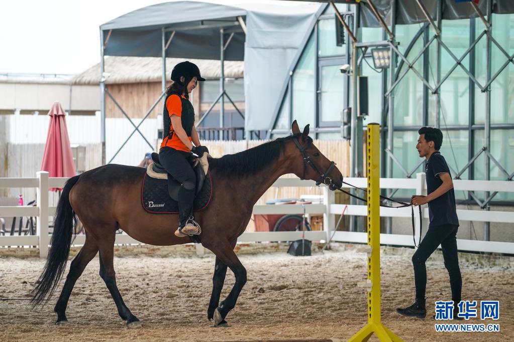 5月11日,游客在常州江南環球港進行體驗馬術運動。
