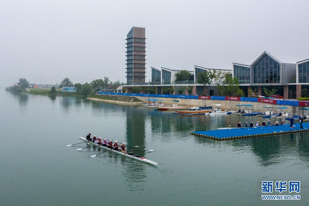 5月12日,游客在揚州生態科技新城深潛娛樂部體驗賽艇(無人機照片)。
