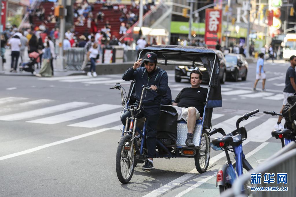 5月14日,游客乘坐人力車經過美國紐約時報廣場。