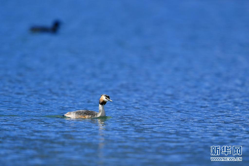 6月14日在拉魯濕地拍攝的鳳頭 。夏日里,鳳頭 和小 在西藏拉薩拉魯濕地國家級自然保護區水面上嬉戲。新華社記者 張汝鋒 攝