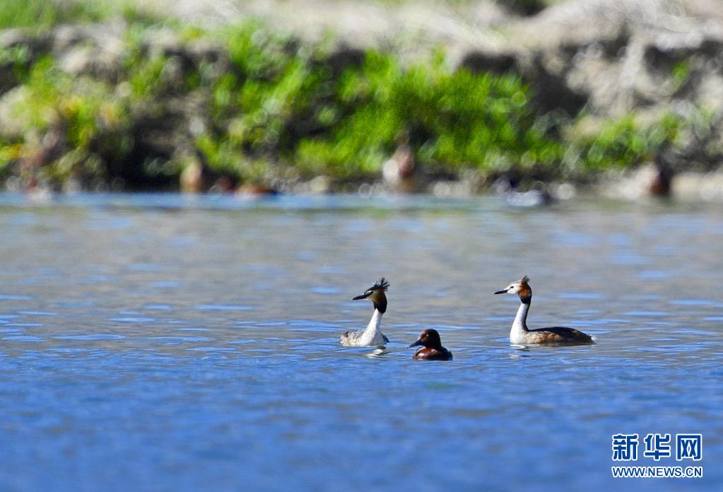 6月14日在拉魯濕地拍攝的兩只鳳頭 和一只小 (中)。夏日里,鳳頭 和小 在西藏拉薩拉魯濕地國家級自然保護區水面上嬉戲。新華社記者 張汝鋒 攝