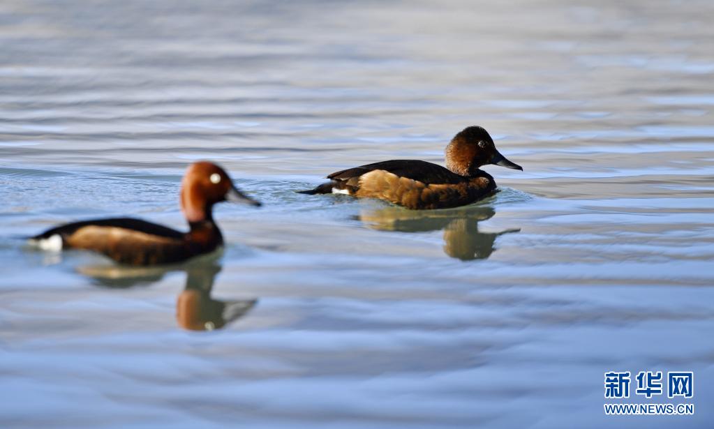 6月14日在拉魯濕地拍攝的兩只鳳頭 。夏日里,鳳頭 和小 在西藏拉薩拉魯濕地國家級自然保護區水面上嬉戲。新華社記者 張汝鋒 攝