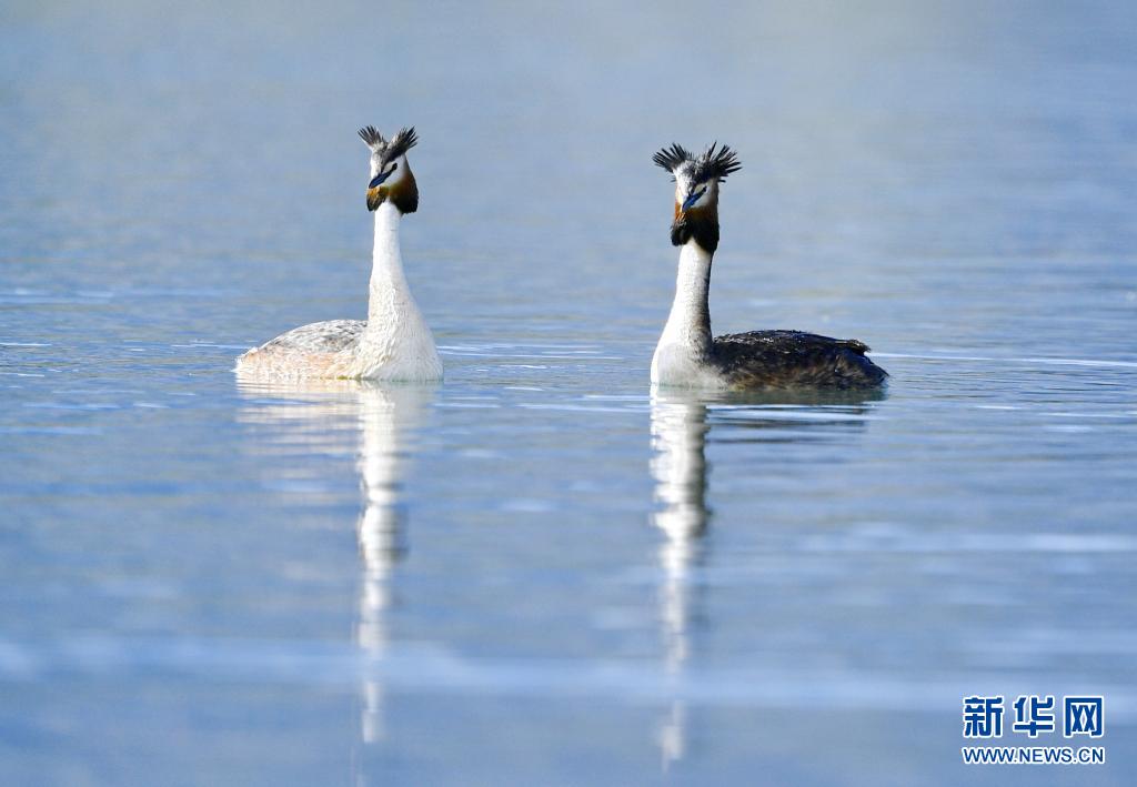 6月14日在拉魯濕地拍攝的兩只鳳頭  。夏日里,鳳頭  和小  在西藏拉薩拉魯濕地國家級自然保護區(qū)水面上嬉戲。新華社記者 張汝鋒 攝