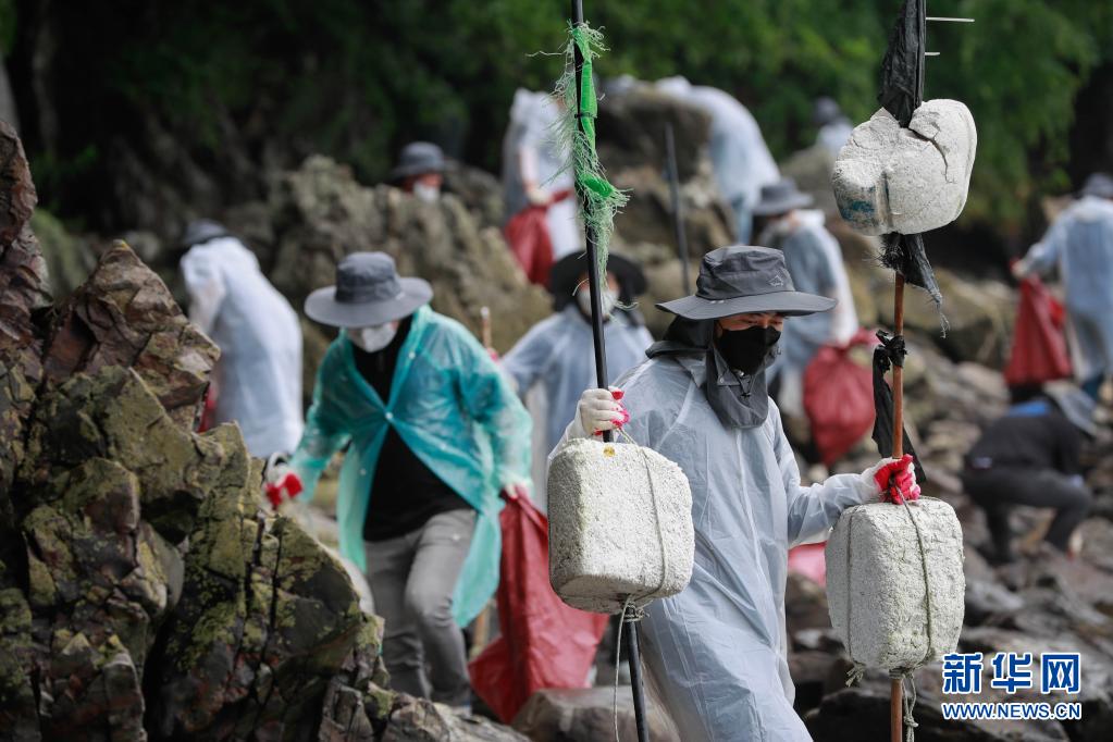 6月18日,工作人員在韓國靈興島海邊清理海洋垃圾。
