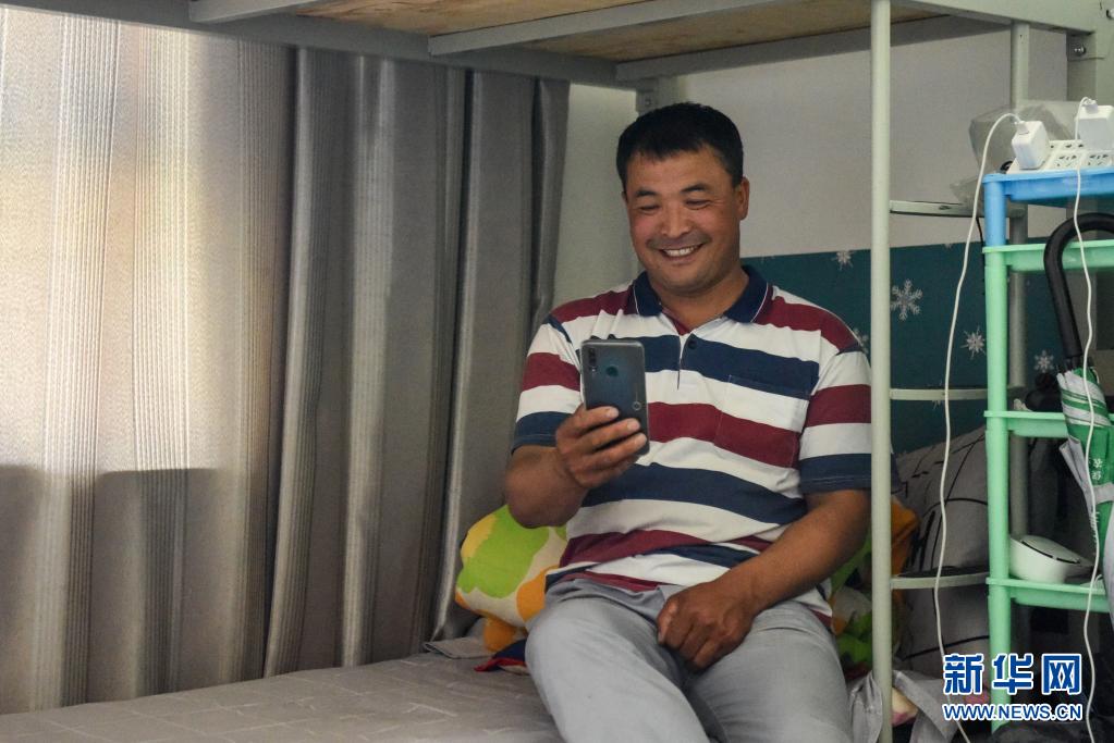 在新疆天蘊有機農業有限公司員工宿舍,吳斯班·阿拉勒拜與家人視頻聊天(6月17日攝)。新華社記者 丁磊 攝