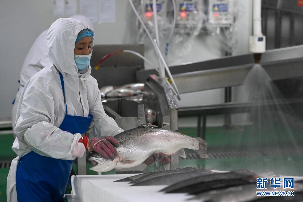 新疆天蘊有機農業有限公司工人在車間加工三文魚(6月17日攝)。新華社記者 丁磊 攝