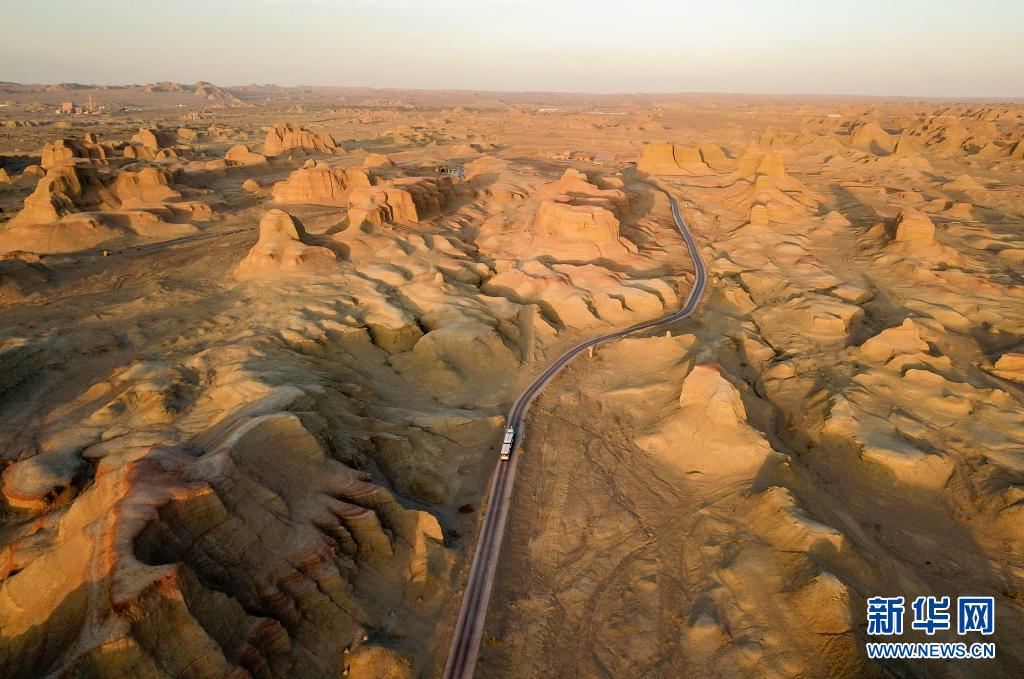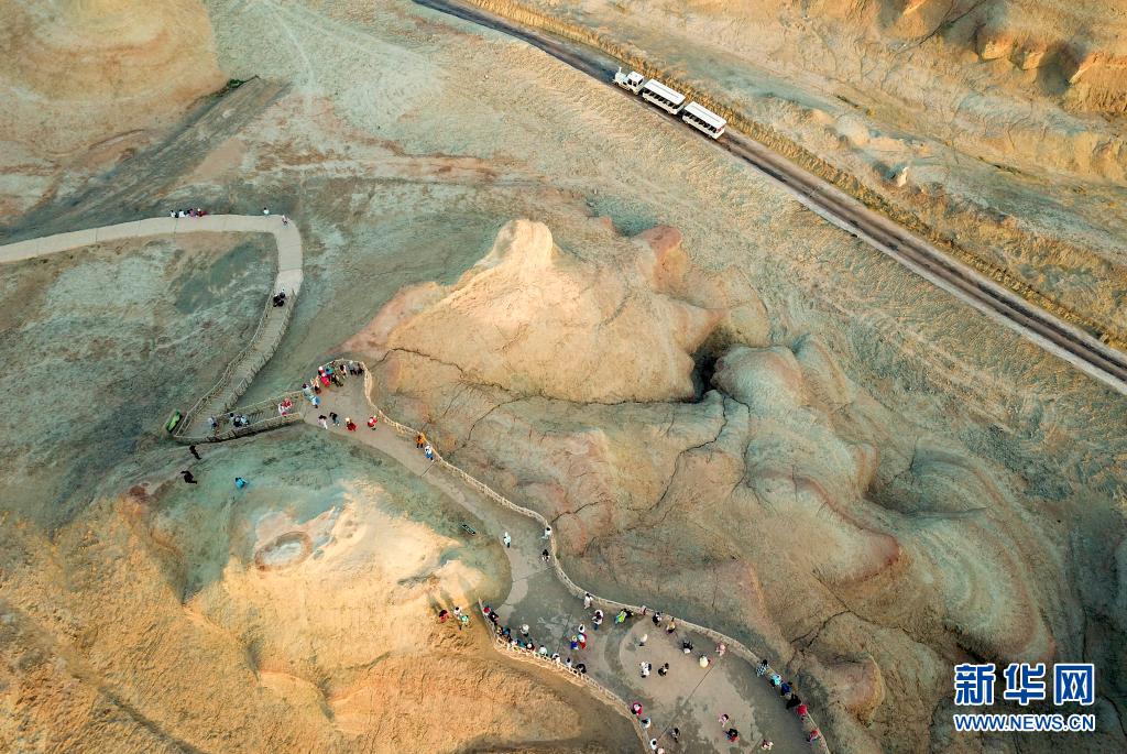 載有游客的觀光車行駛在新疆克拉瑪依烏爾禾世界魔鬼城景區內(6月21日攝,無人機照片)。 世界魔鬼城景區位于新疆克拉瑪依市烏爾禾區,屬于典型的雅丹地貌。盛夏時節,景區正值旅游旺季,壯美的風光令游客沉醉其中。 新華社記者 顧煜 攝