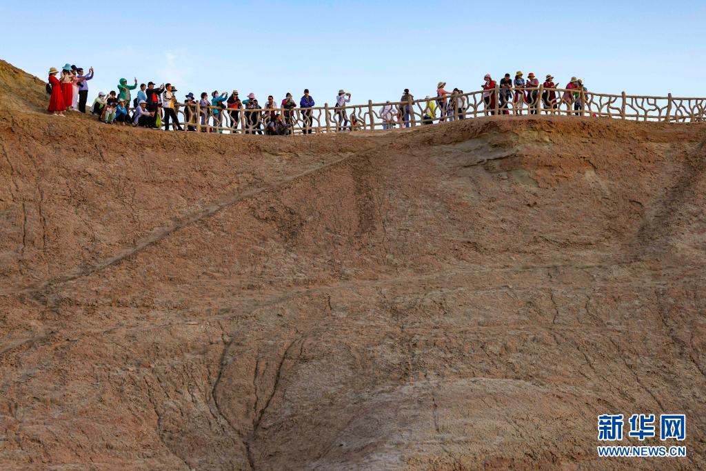 游客在新疆克拉瑪依烏爾禾世界魔鬼城景區內拍照游玩(6月21日攝)。 世界魔鬼城景區位于新疆克拉瑪依市烏爾禾區,屬于典型的雅丹地貌。盛夏時節,景區正值旅游旺季,壯美的風光令游客沉醉其中。 新華社記者 胡虎虎 攝