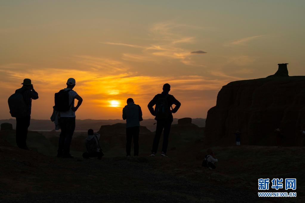 游客在新疆克拉瑪依烏爾禾世界魔鬼城景區欣賞日落(6月21日攝)。 世界魔鬼城景區位于新疆克拉瑪依市烏爾禾區,屬于典型的雅丹地貌。盛夏時節,景區正值旅游旺季,壯美的風光令游客沉醉其中。 新華社記者 胡虎虎 攝