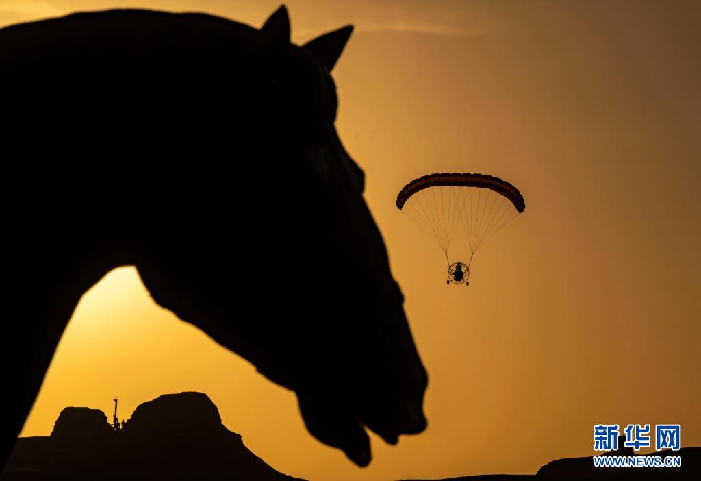 游客乘坐動力傘在新疆克拉瑪依烏爾禾世界魔鬼城景區內游玩(6月21日攝)。 世界魔鬼城景區位于新疆克拉瑪依市烏爾禾區,屬于典型的雅丹地貌。盛夏時節,景區正值旅游旺季,壯美的風光令游客沉醉其中。 新華社記者 胡虎虎 攝