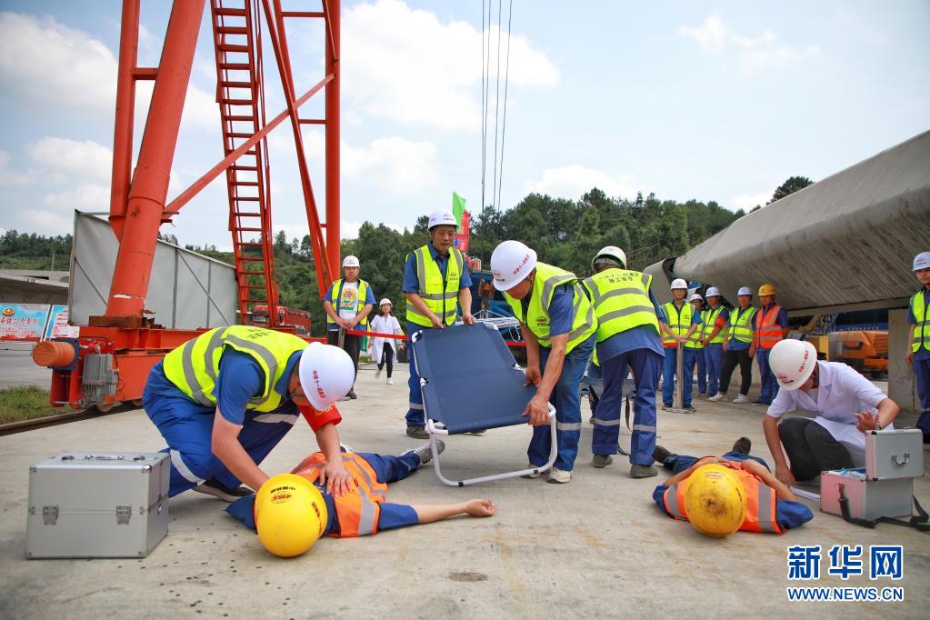6月22日,參演人員進行救援演練。 當(dāng)日,貴南高鐵起重傷害應(yīng)急救援演練在貴州省獨山縣中鐵十一局橋梁公司貴南高鐵梁枕場舉行,通過模擬人員在吊裝過程中受到傷害后進行緊急救援,檢驗應(yīng)急救援能力,推動安全責(zé)任落實,保障安全生產(chǎn)。 新華社記者 劉續(xù) 攝