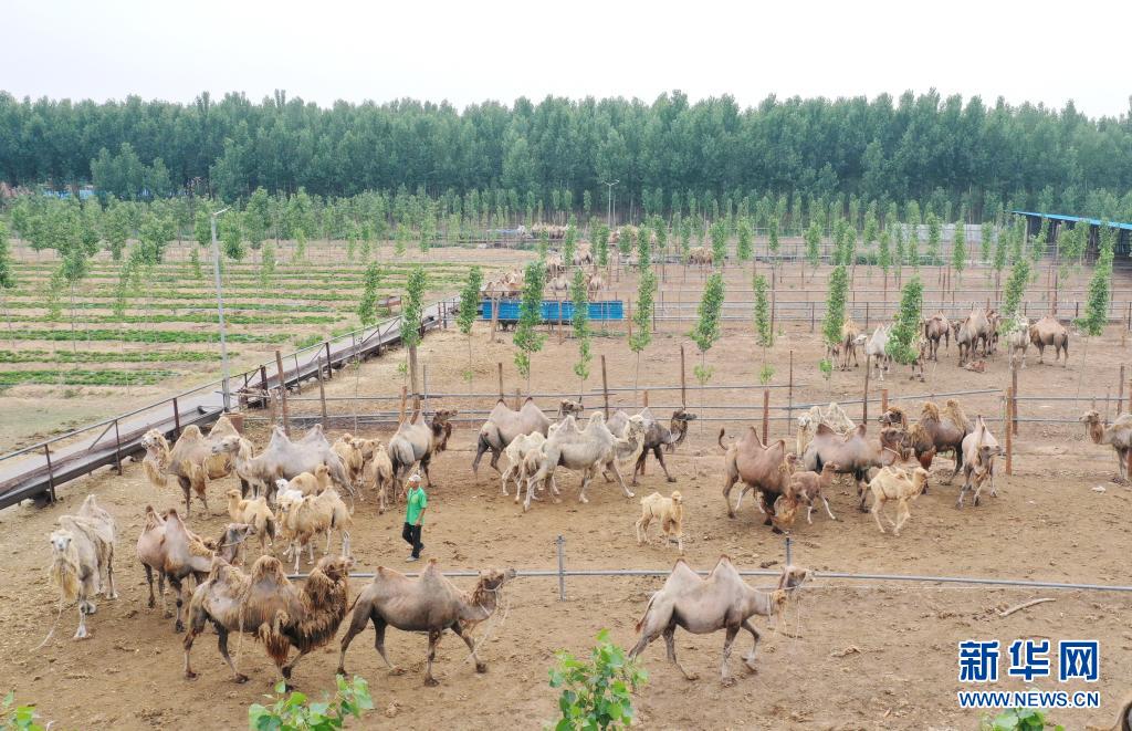 6月24日,唐山市豐南區漠尚客駱駝養殖專業合作社的工作人員在駱駝圈工作(無人機照片)。
