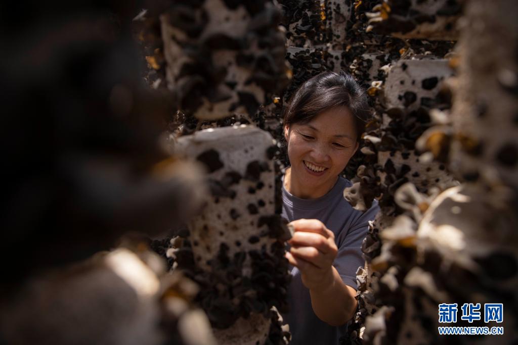 在黑龍江省雙鴨山市饒河縣四排赫哲族鄉四排村,脫貧戶畢偉君在大棚里采摘木耳(6月23日攝)。新華社記者 張濤 攝