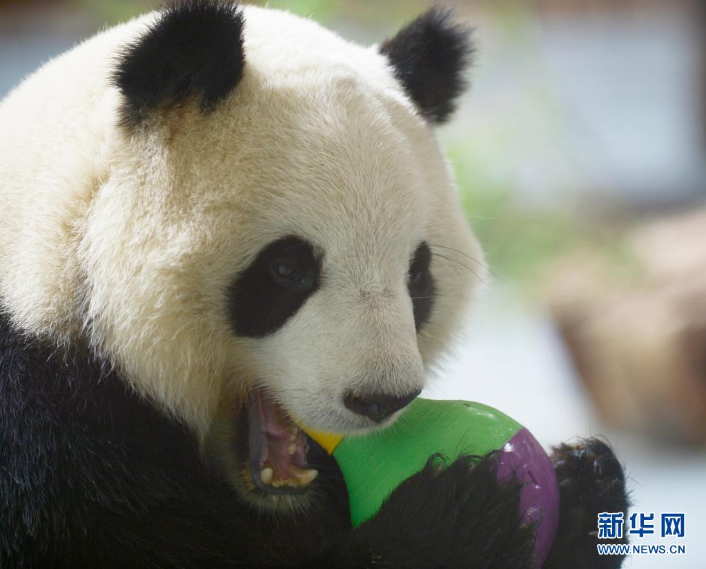 6月27日在青海省西寧熊貓館拍攝的大熊貓“奇果”。 當日,在青海省西寧熊貓館,大熊貓“奇果”“園滿”迎來5歲生日會。工作人員用蘋果、竹子等食物做成生日蛋糕和美食,還準備了不倒翁取食器等玩具為它們慶生。 新華社記者 張曼怡 攝