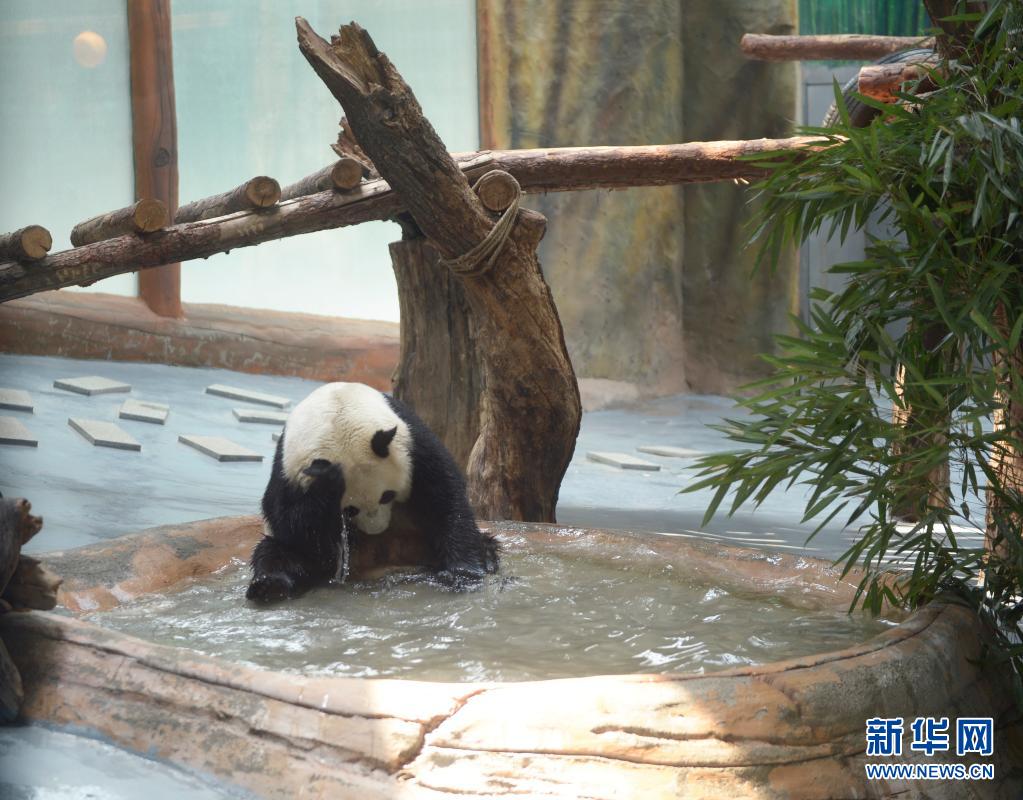 6月27日,在青海省西寧熊貓館,大熊貓“園滿”在水池中玩耍。