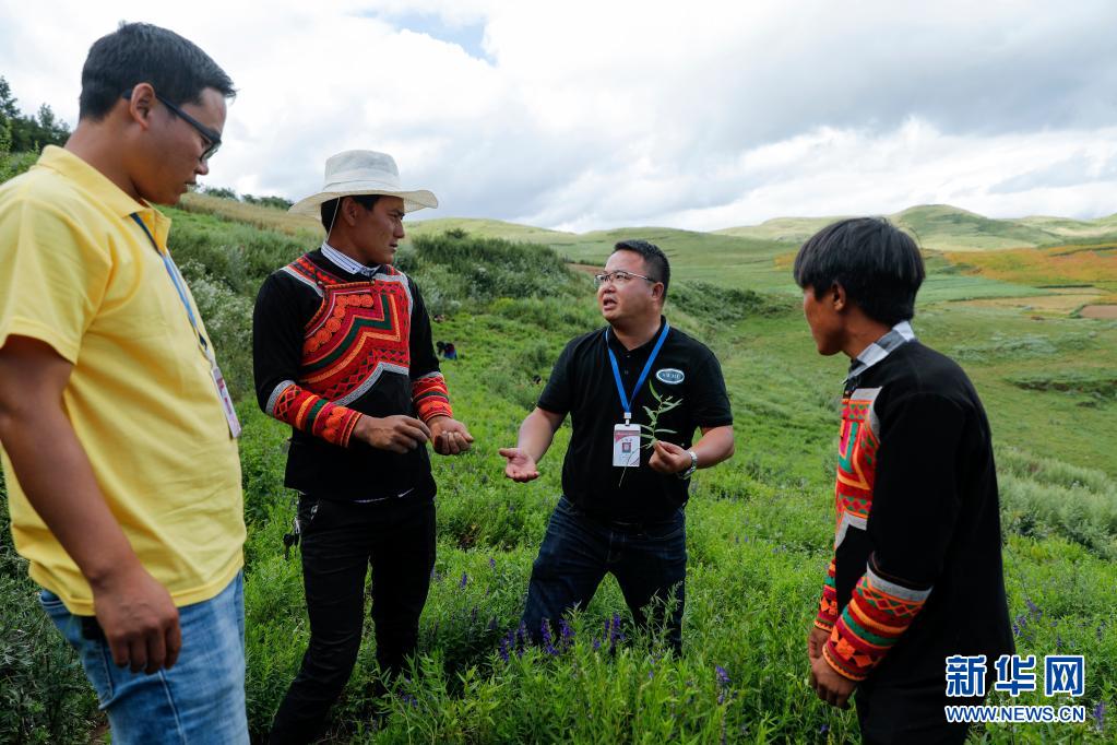 在位于四川省涼山彝族自治州昭覺縣龍溝鄉境內的海拔2850米的波火爾且高山坡地上的黃芩種植基地,西南醫科大學副教授夏紀毅(右二)和該校派出的駐村工作隊員俄且莫機(左一)為當地彝族群眾講授黃芩種植和采摘技術(2020年8月14日攝)。新華社記者 沈伯韓 攝