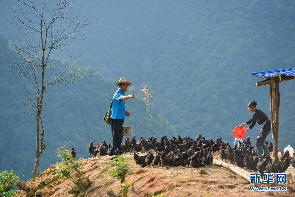 貴州省劍河縣南明鎮臺沙村駐村第一書記楊精澤(左)與村民在合作社里喂雞(2017年6月7日攝)。新華社記者 楊文斌 攝