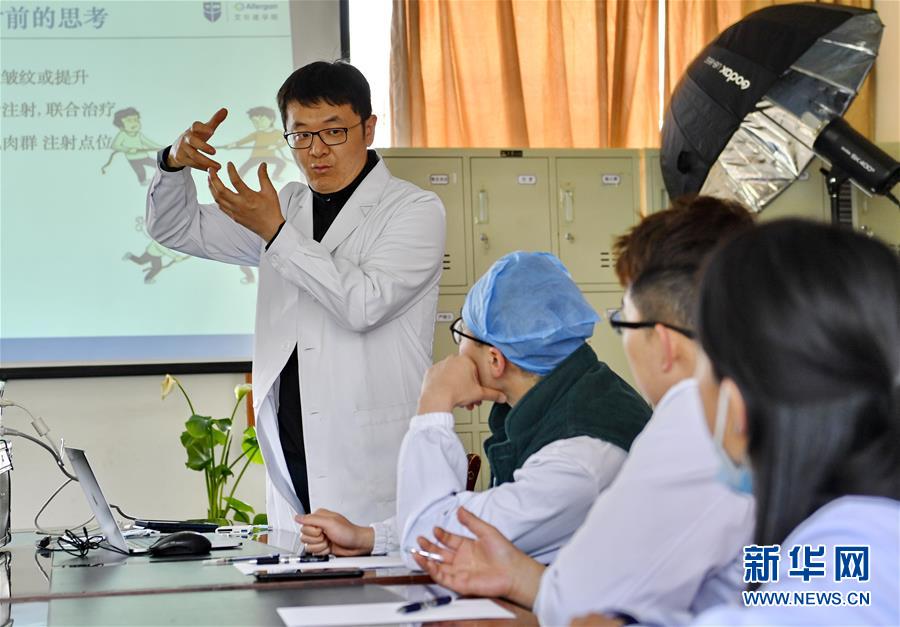 在西藏自治區(qū)人民醫(yī)院,王克明(左一)在進行醫(yī)學整形外科培訓(5月14日攝)。 新華社記者 張汝鋒 攝 |