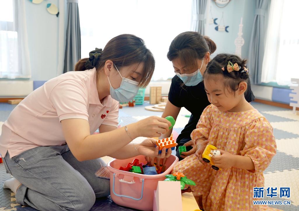 7月14日,在奉賢區奉浦街道秦塘生活驛站,早教老師在指導小朋友玩游戲。 當日,“賢城早教專列”公益科學育兒指導服務走進上海市奉賢區奉浦街道秦塘生活驛站,專業人士為家長們提供親子閱讀、親子游戲、營養健康、幼兒意外傷害急救等指導。今年以來,上海市采取“進樓宇、進園區、進場館、進社區、進家庭”的方式,為更多適齡幼兒家庭提供精準的科學育兒指導服務。 新華社記者 劉穎 攝