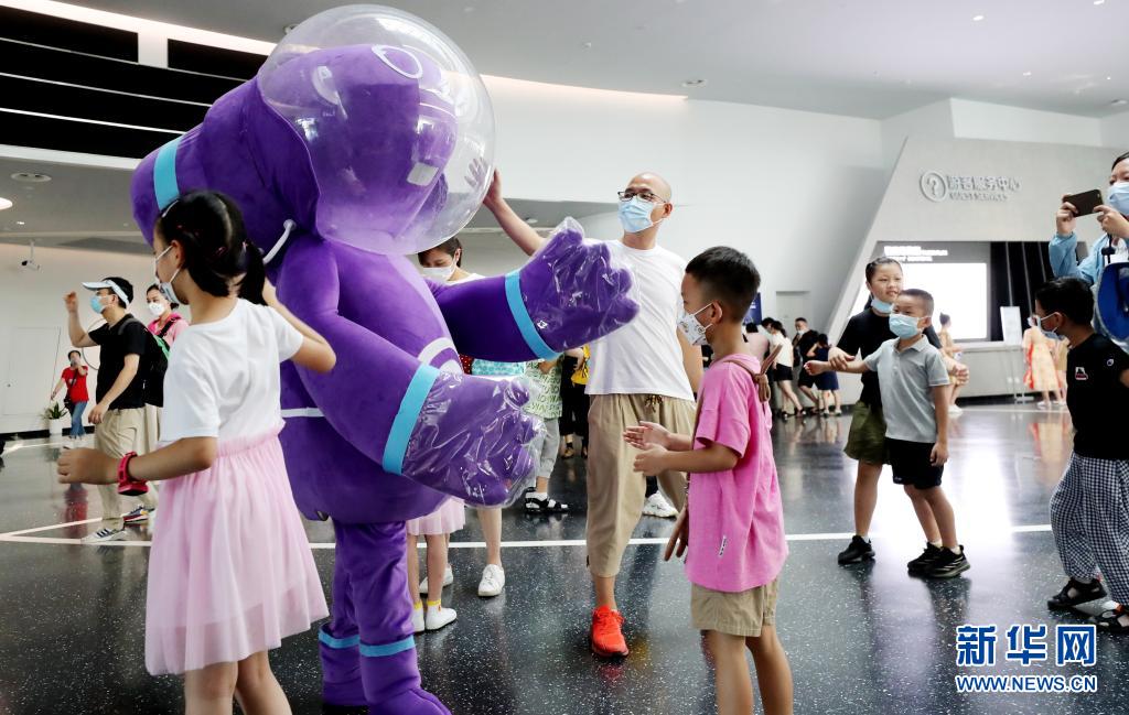 7月18日,上海天文館吉祥物“科飛”在入口大廳內與參觀者互動。