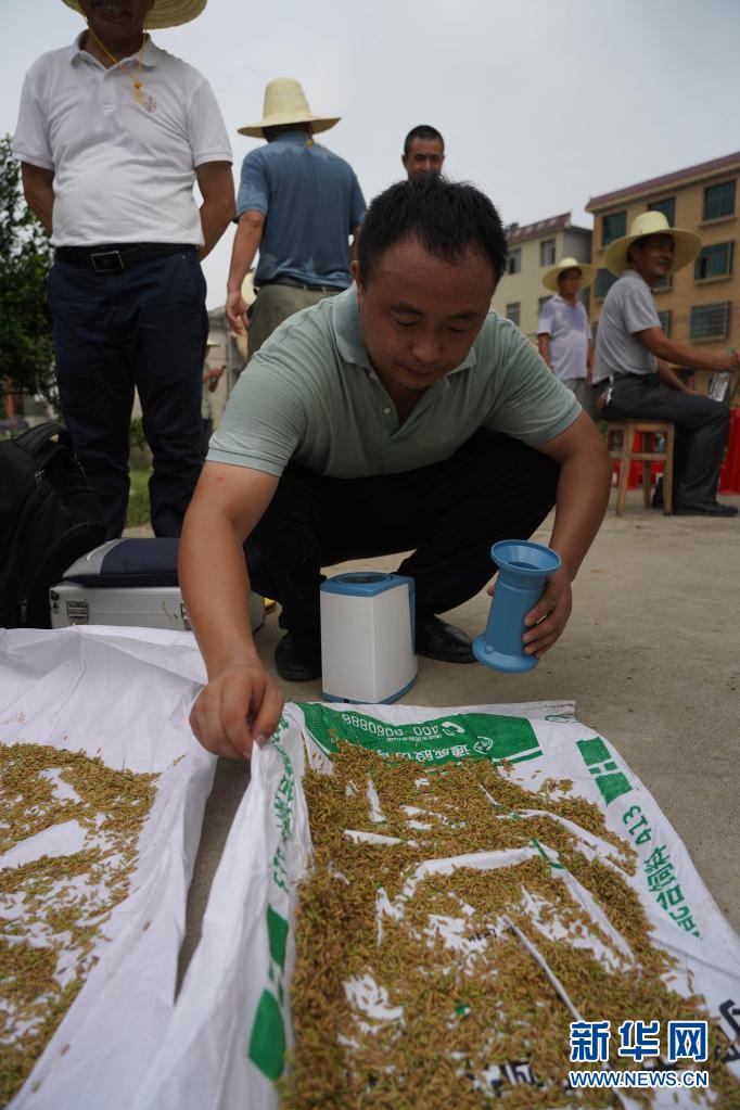 7月19日,工作人員在檢測“中科發早粳1號”稻谷的含水量。