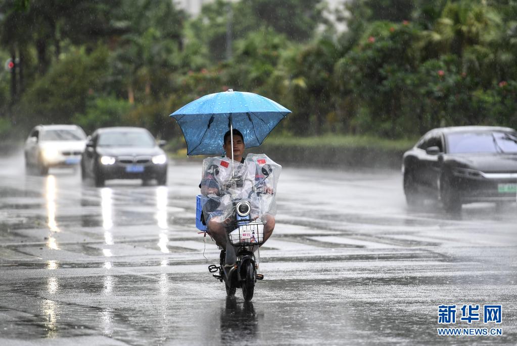 7月19日,居民騎著電動車在雨中前行。