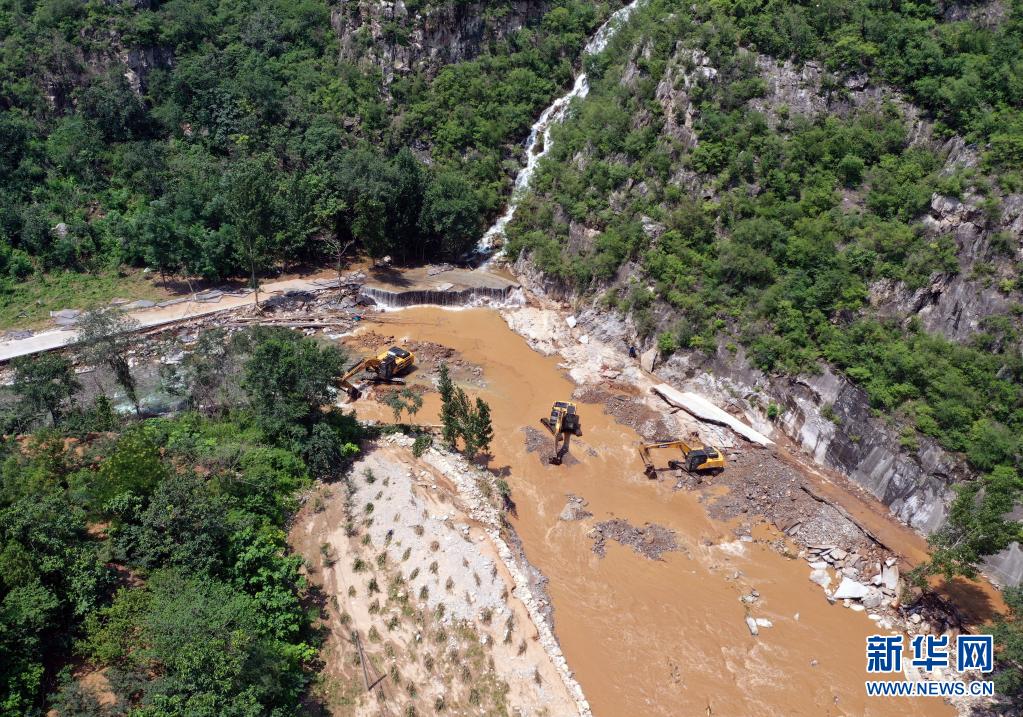 7月25日,在淇縣黃洞鄉魚大線公路旁,三臺挖掘機同時作業,搶修道路(無人機照片)。