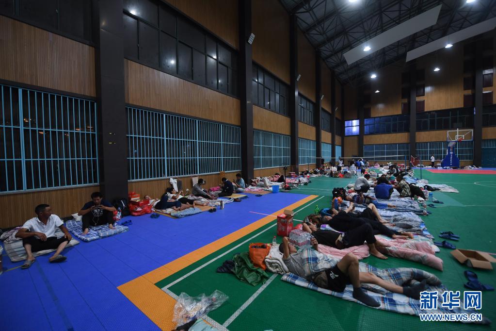 7月25日晚,在浙江嘉興平湖市乍浦高級中學(xué)避災(zāi)點,從周邊工地轉(zhuǎn)移到這里的工人在休息。 據(jù)中央氣象臺消息,預(yù)計臺風(fēng)“煙花”將于7月25日夜間到26日上午在浙江平湖到上海浦東一帶沿海再次登陸。新華社記者 徐昱 攝