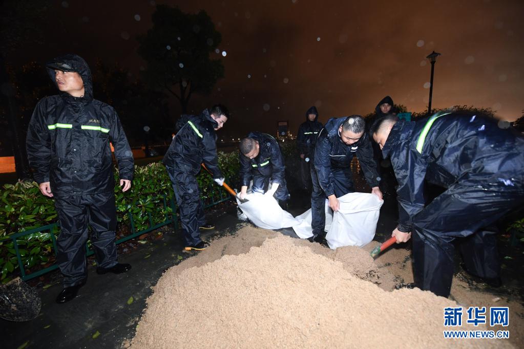 7月25日晚,在毗鄰杭州灣的浙江嘉興平湖市乍浦湯山公園,工作人員加緊壘沙包以防海水倒灌。 據(jù)中央氣象臺消息,預(yù)計臺風(fēng)“煙花”將于7月25日夜間到26日上午在浙江平湖到上海浦東一帶沿海再次登陸。新華社記者 徐昱 攝