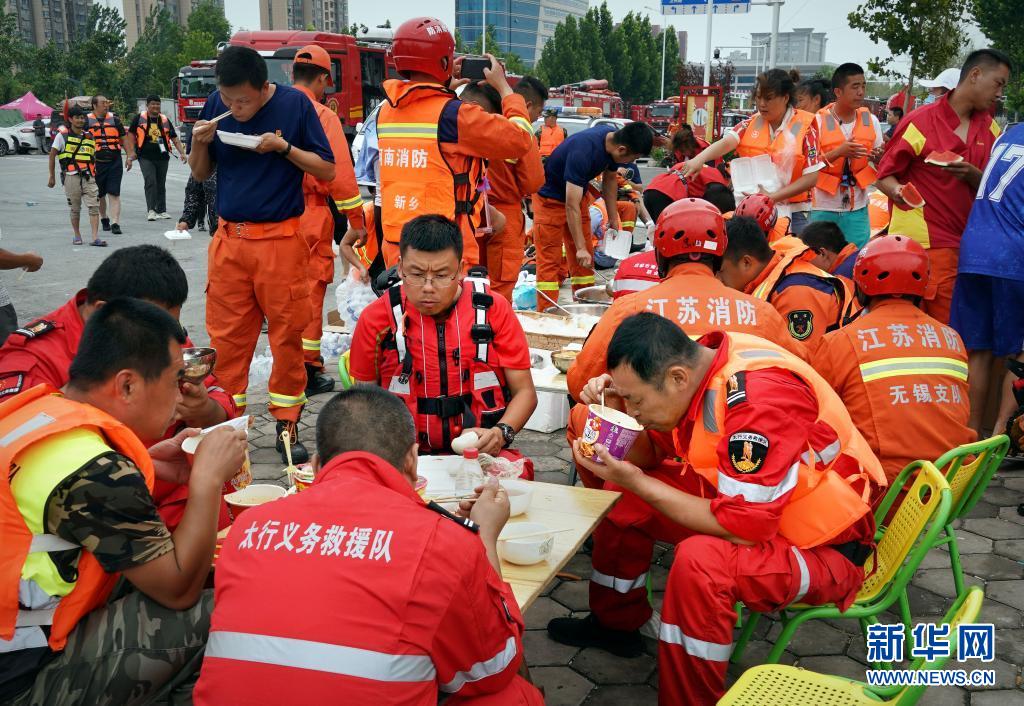 7月28日,救援人員在衛(wèi)輝市明珠花園小區(qū)居民開設的就餐點吃飯。 “燴菜、面條、綠豆粥,這有飯,大家來吃吧。”河南省衛(wèi)輝市明珠花園小區(qū)外,兩口大鍋、幾張桌子,旁邊擺放著做好的飯菜,小區(qū)居民熱情地招呼著救援人員吃飯。 近日,受持續(xù)強降雨影響,衛(wèi)輝市內澇嚴重,很多小區(qū)被積水圍困,來自全國各地的救援人員夜以繼日地開展轉移群眾、排水排澇作業(yè)。為了能讓救援人員吃上熱飯菜,明珠花園小區(qū)的居民自發(fā)組織起來,在小區(qū)外支起就餐點,免費為救援人員提供飯菜?!八麄儚乃拿姘朔节s來幫助我們,我們要以心換心,用自己的方式幫助他們。”明珠花園小區(qū)的居民說。新華社記者 李安 攝