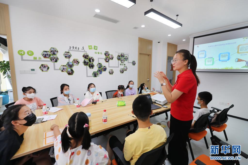7月30日,一位社區法律服務工作人員在議事會上向小成員們講解《中華人民共和國未成年人保護法》的相關知識。新華社記者 方喆 攝