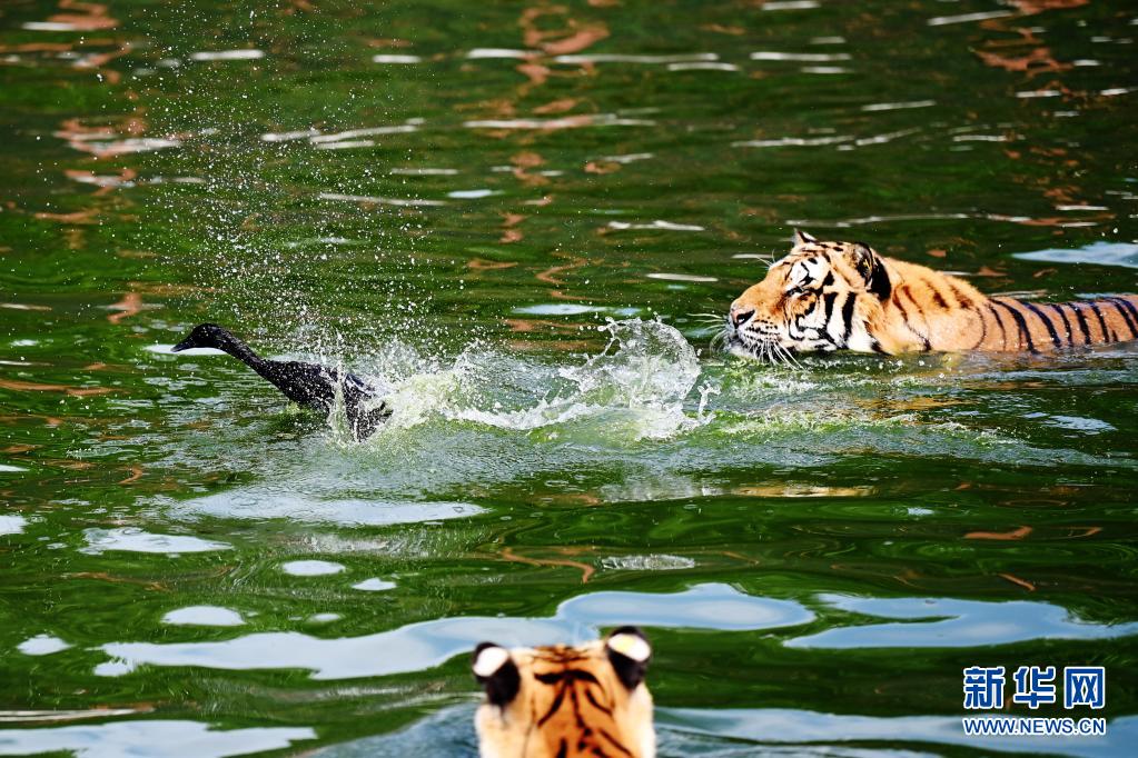 在橫道河子東北虎林園野化訓練區水池中,東北虎在捕食鴨子(7月26日攝)。 新華社記者 王建威 攝
