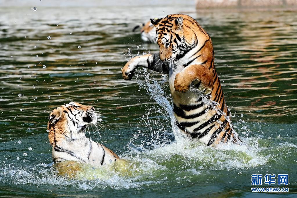 在橫道河子東北虎林園野化訓練區水池中,兩只東北虎在打鬧(7月26日攝)。