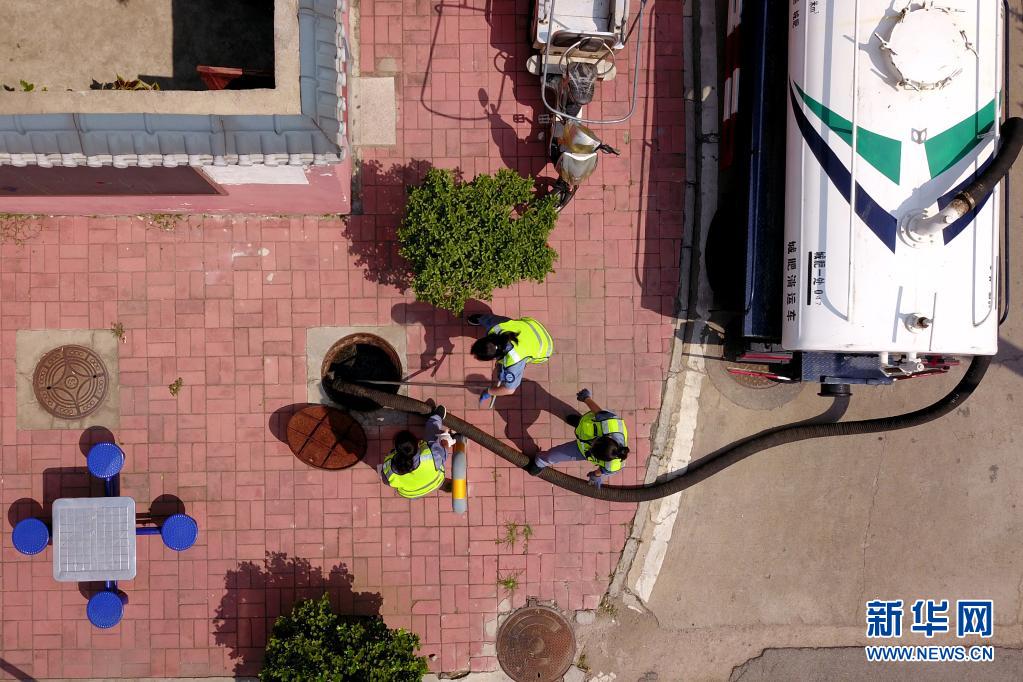 8月4日,濟南市城管局城肥清運管理一處女子清疏班在中大槐樹街道作業(無人機照片)。新華社記者 郭緒雷 攝