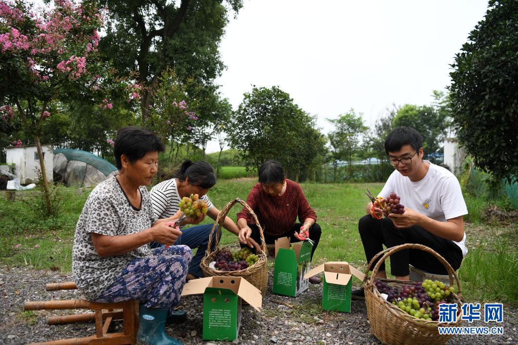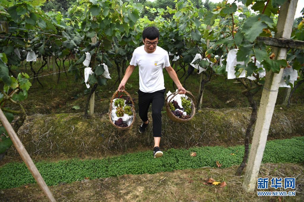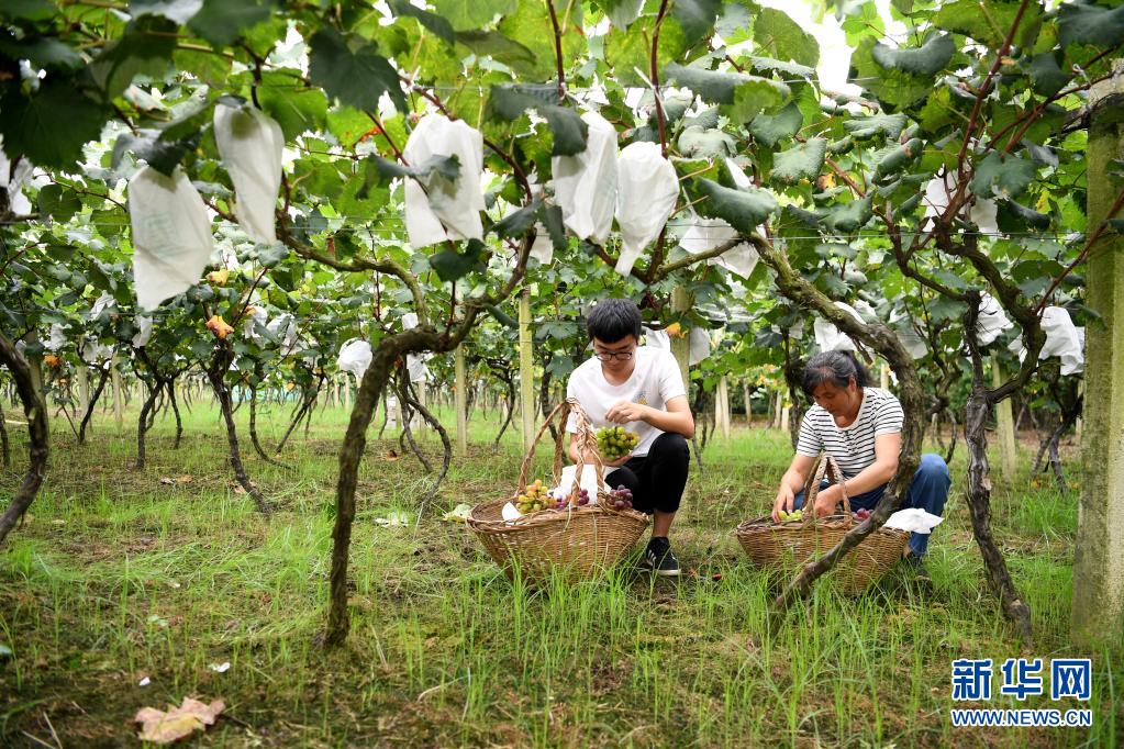 8月10日,丁翔在農場葡萄園里采摘葡萄。 “90后”小伙丁翔是安徽省合肥市肥西縣花崗鎮楊灣村的村民。2017年,大學畢業后的丁翔回到家鄉,在自家30多畝土地基礎上逐步打造以葡萄種植園為主的家庭農場。經過幾年的投入和建設,丁翔的農場初具規模,多個品種的葡萄供應合肥周邊市場。農場建設和果園日常管理有不少用工需求,帶動周邊村民實現就業增收,助力鄉村振興。 新華社記者 劉軍喜 攝