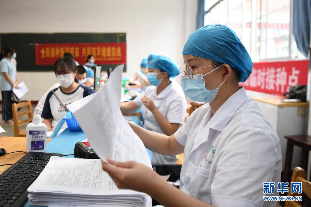 8月14日,醫務人員在為長沙市湘一芙蓉第二中學學生接種疫苗前檢查其新型冠狀病毒疫苗接種知情同意書上是否有監護人簽字。