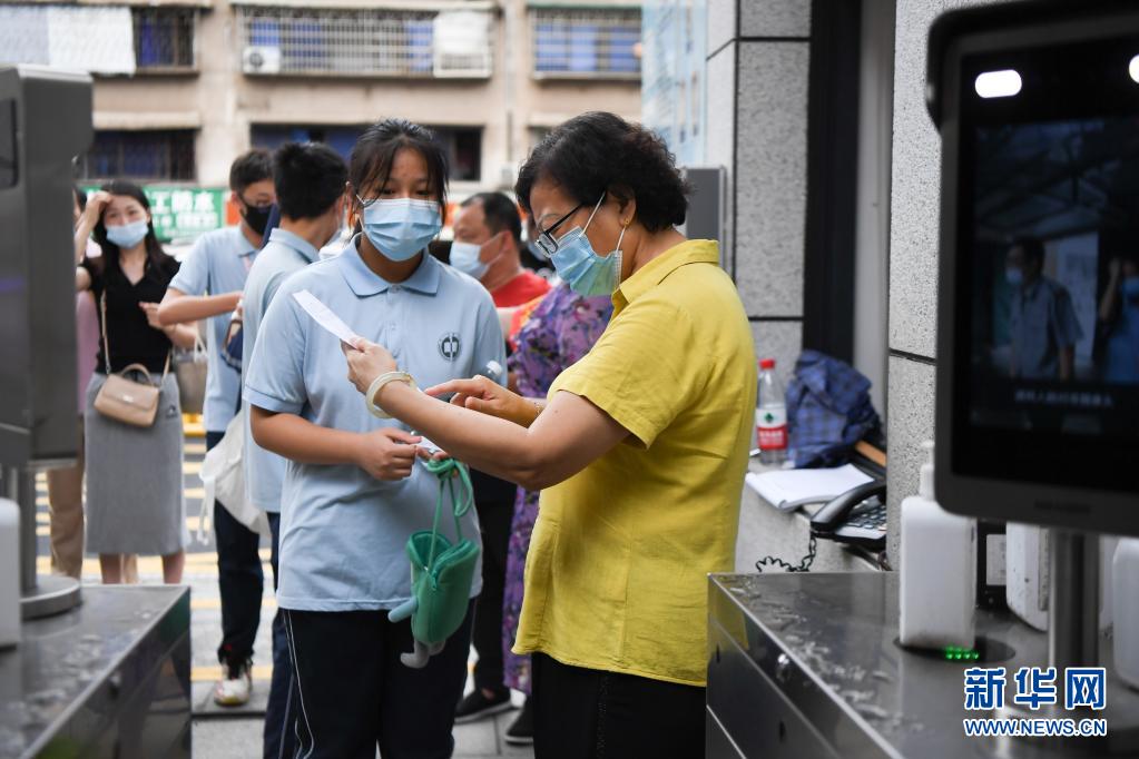 8月14日,工作人員在湖南省長沙市湘一芙蓉第二中學門口檢查學生的新型冠狀病毒疫苗接種知情同意書、健康碼等。