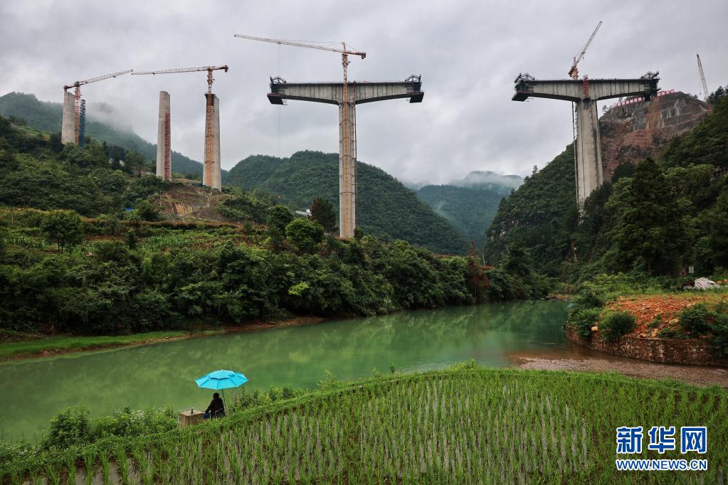 這是位于貴州省貴定縣的貴南高鐵桐子園雙線特大橋施工現(xiàn)場(2021年6月11日攝,無人機照片)。