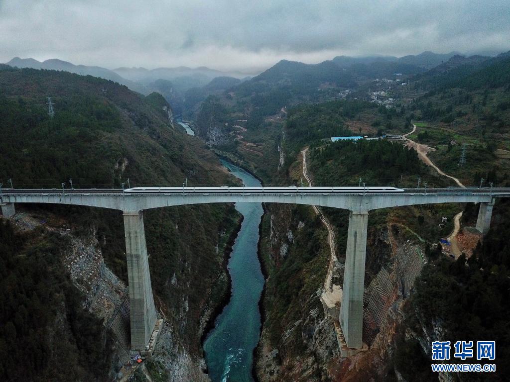 渝貴鐵路從貴陽北到重慶西的D8592次首發動車經過遵義市境內的烏江大橋(2018年1月25日攝,無人機照片)。