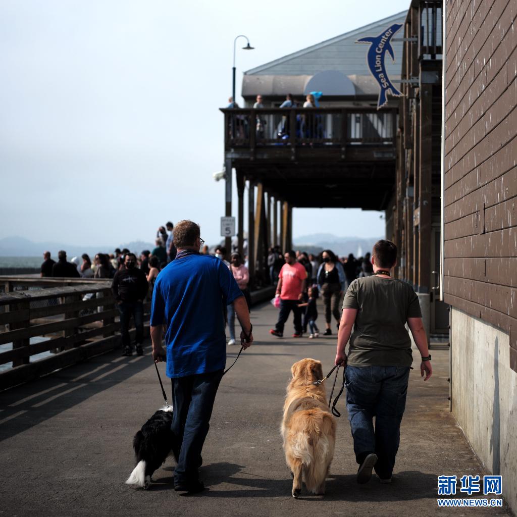 8月15日,人們在美國舊金山海邊碼頭遛狗。 由于新冠疫情大幅反彈,美國舊金山市頒布衛生條令,從8月20日起,只有完成疫苗接種的市民才能進入酒吧、餐廳、健身房、劇院等室內場所。 新華社記者 吳曉凌 攝