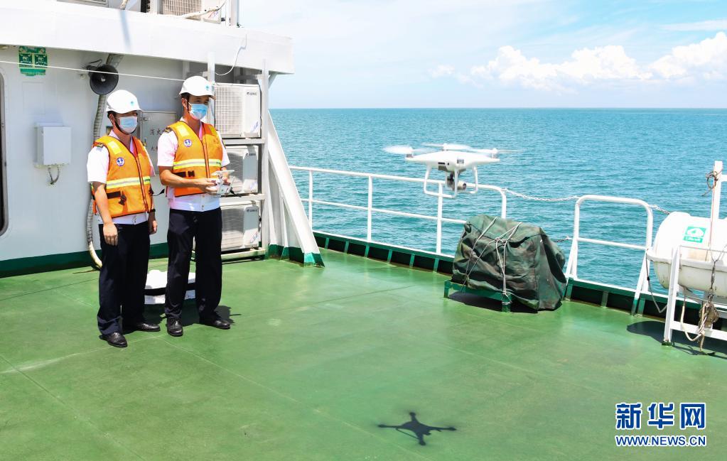 8月16日,海南海事部門工作人員在“海巡1102”輪上使用無人機查看瓊州海峽通航情況。據了解,為保障數萬艘漁船集中通過瓊州海峽出海作業,海南海事、農業、綜合執法等部門聯合開展巡航執法行動,共同護航開漁安全。新華社記者 楊冠宇 攝