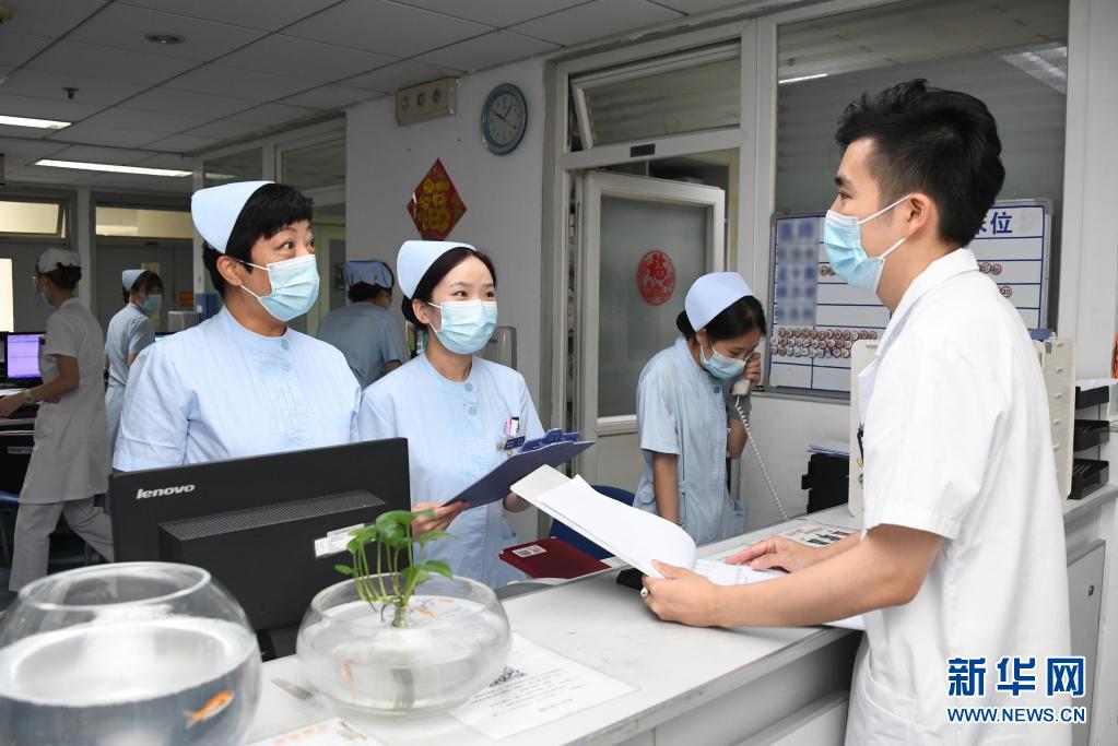 在北京市海淀醫院住院樓骨科病房護士站,馬元(右一)向值班護士了解患者情況(8月12日攝)。新華社記者 任超 攝