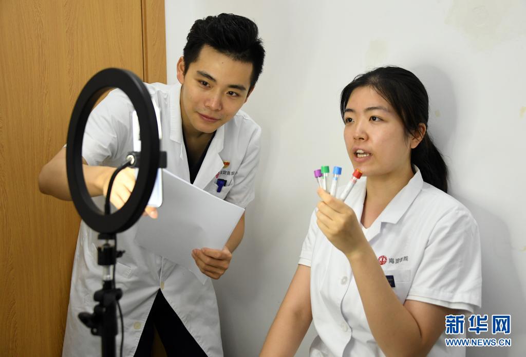 8月18日,在北京市海淀醫院,馬元(左)指導視頻小組成員韓雪英拍攝醫學知識短視頻。新華社記者 任超 攝
