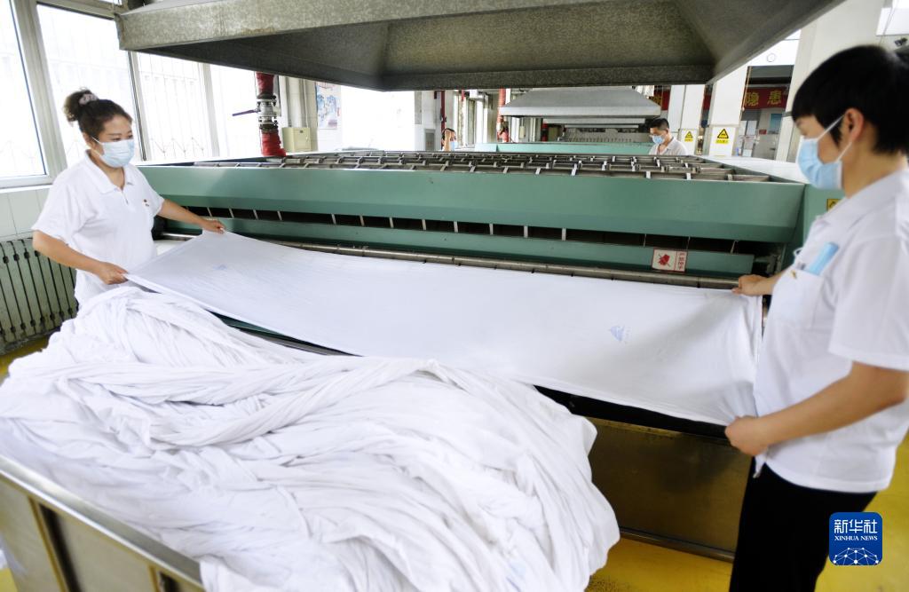 8月23日,北京客運段洗滌車間的工作人員在對洗滌后的臥具進行高溫熨燙。 中國鐵路北京局集團有限公司北京客運段為保障旅客出行安全,加強列車臥具、窗簾、臺布洗滌過程中的防疫消毒工作,北京客運段洗滌車間的所有洗滌物品都要經(jīng)過洗滌前消毒、高溫洗滌、滅菌洗滌和高溫熨燙四道消殺滅菌工序,保障鐵路出行安全。 新華社記者 李欣 攝