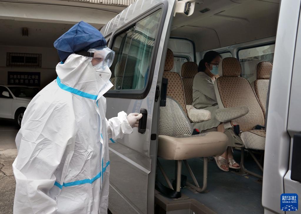 8月24日,在華東師范大學門口,參加演練的防疫人員準備將“發(fā)熱人員”用專車送至“臨時留觀點”。